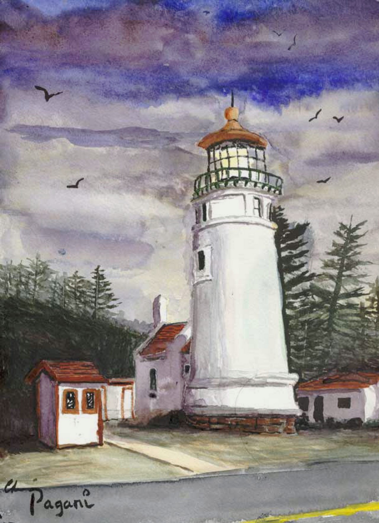 Watercolor Sketch Umqua Lighthouse Oregon Painting Posted on June 14, 2005January 5, 2023 It has its own place in history.Although lighthouses are considered old-fashioned and outmoded by todays uber technology, it only takes one good sunspot storm to make them needed again… Umqua Lighthouse (original Oregon watercolor painting) 9″ x 12″