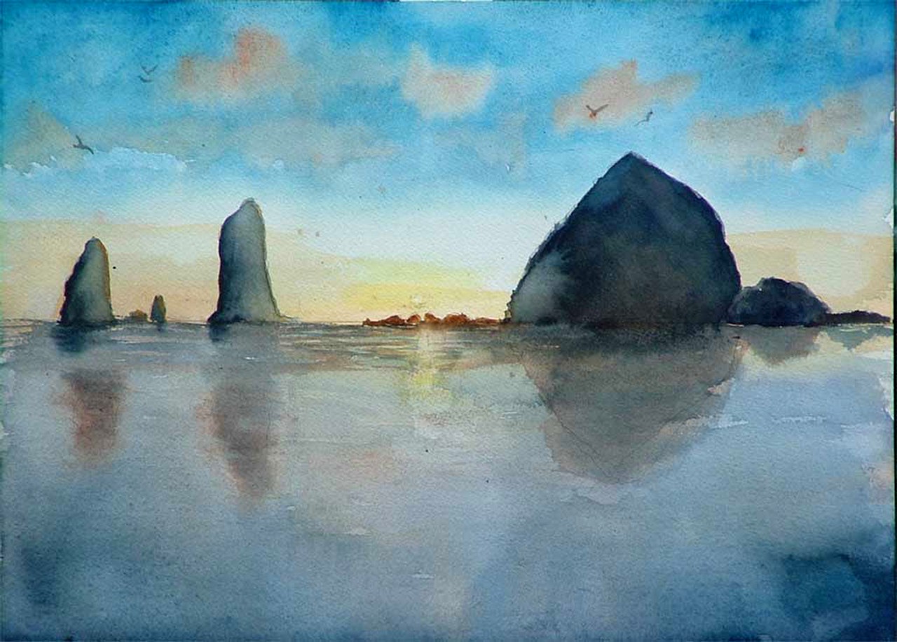Cannon Beach Rocks Sunset Watercolor Painting
